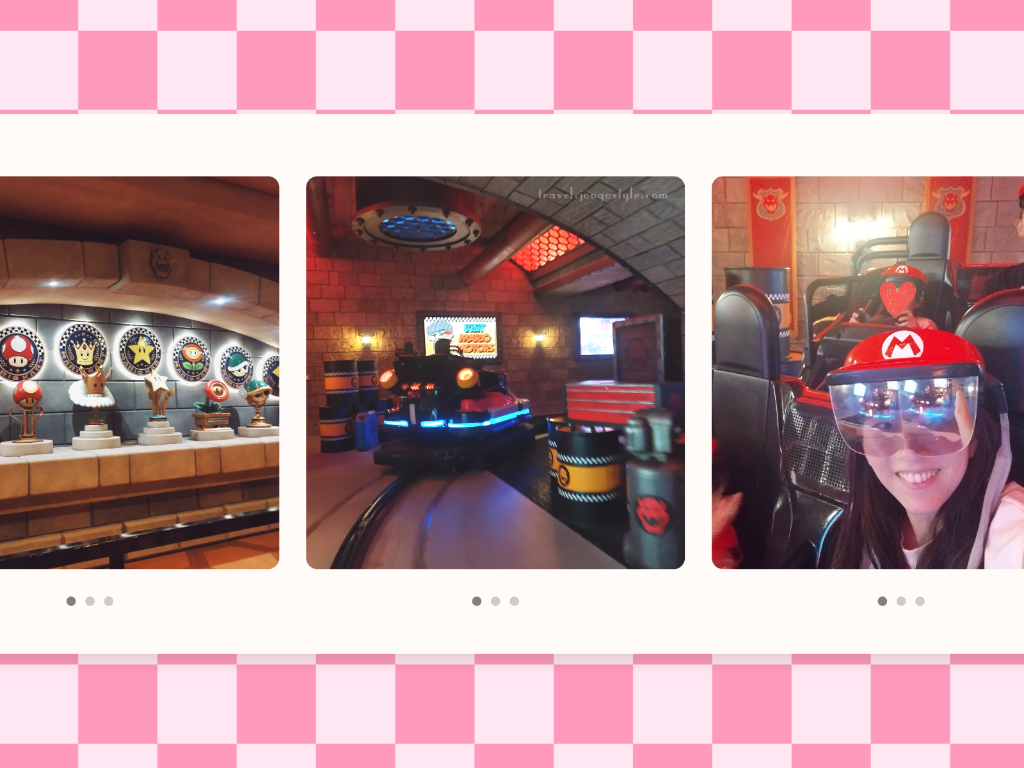 Hubby checked the expected queue time in the USJ APP and saw that it’s a 2-hour wait. The single-rider lane also requires approximately 30 minutes. However, the place looks half empty, and so we decided to continue queuing. Who knows, the queue continues to snake inside Bower’s Castle (hidden from view when we first joined), and I was half-regretting by then. But USJ had made the queuing experience slightly better as we walked through a thought-out set of towering stone walls and spiked fences, while admiring the trophies, racing gear, and portraits of Bowser’s victories.