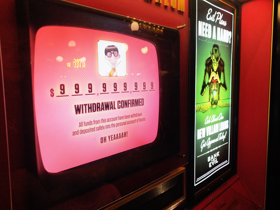 Before you leave Minion Park, be sure to visit the “Bank of Evil” in Minion Park to withdraw money of any amount… from someone else’s bank account. ;)