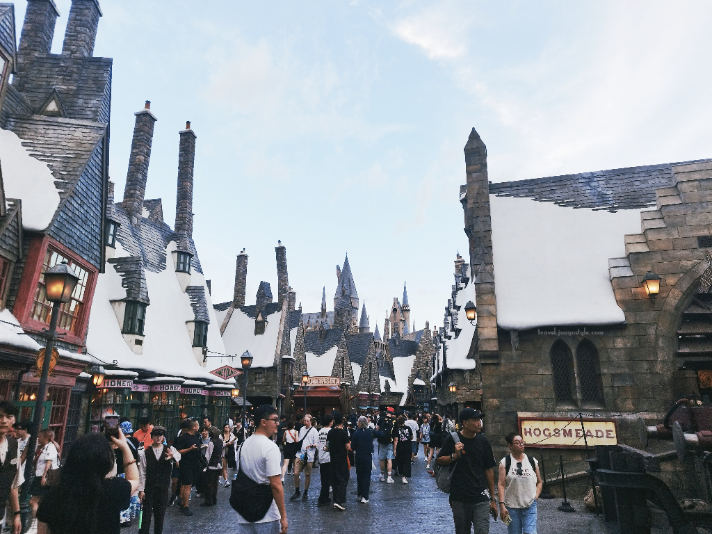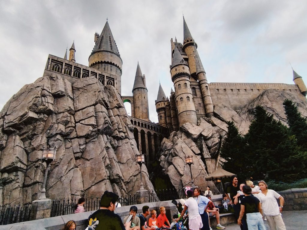 We walked along a long path lined with fir trees, leading up to a striking recreation of the iconic scene where the enchanted Ford Anglia crashes into the Whomping Willow—building anticipation as we approached. When we finally reached the world, Hogwarts Limited Express was on our right, and it felt like we alighted the train and stepped into the streets of Harry Potter. I was wow-ed. The evening glow added another layer to the atmosphere. As the USJ website describes this area, “a magnificent area reproducing the world from Harry Potter on an overwhelming scale and meticulous attention to detail.” I was thankful I didn’t miss this for the Minions, at least at this point.