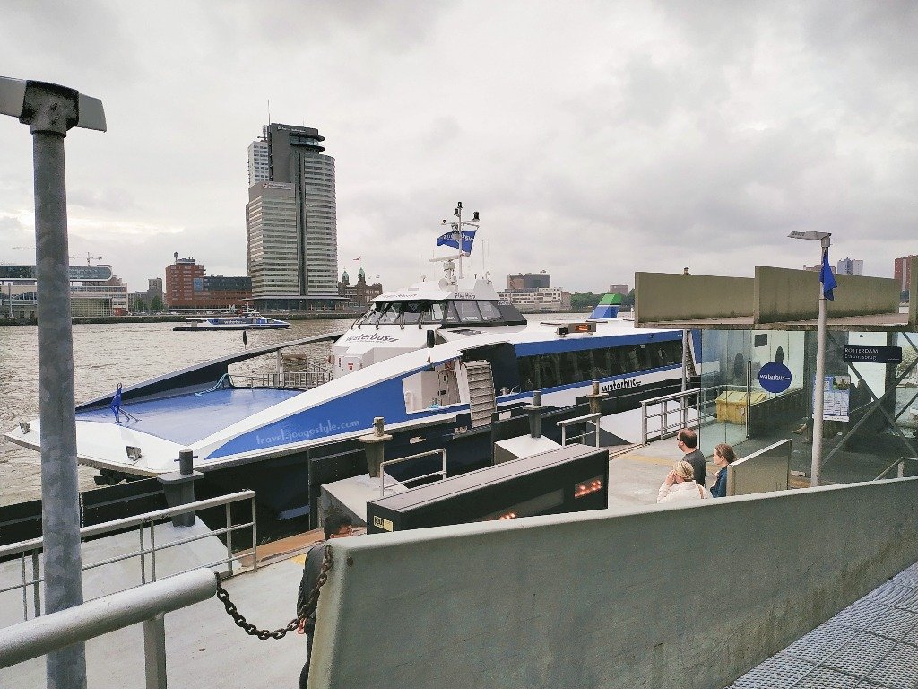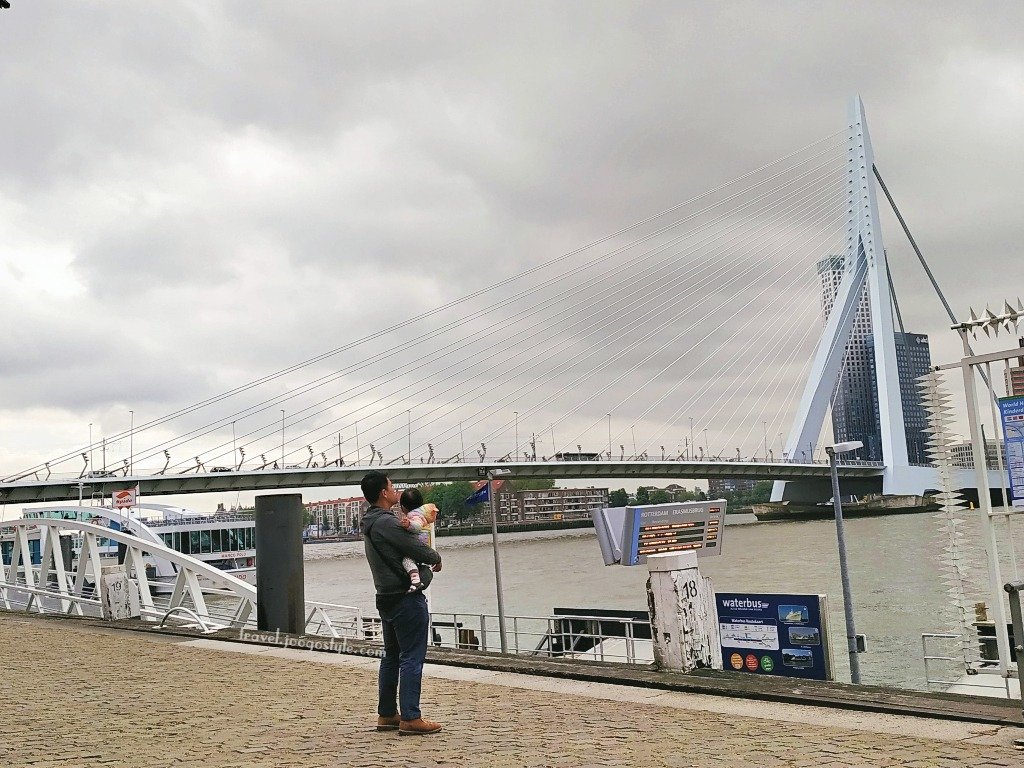 We took a bus to the ferry terminal at Erasmusbrug (Rotterdam). While waiting for Waterbus (Line 202), we snapped photos with the famous Erasmus Bridge. The 800m bridge is a remarkable engineering feat that’s built from light-blue steel, with one-armed pylon jutting out high into the sky and a row of 40 steel cables across the water.